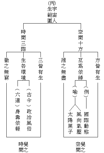 底下是比喻,‘古今政治风俗’,虽然不相同,它有密切的关系。‘六道身寿依报’,六道里面每一道的身形、寿命、生活环境,状况也各个不相同,我们到后面再来讨论。‘澈之无穷’,就是‘觉之时间’。