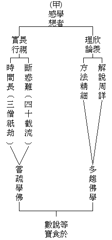 ‘畏视实行’:讲到修行,产生畏惧。‘断惑难’:惑是迷惑、见思烦恼。佛曾经有个比喻,‘四十截流’,流就是瀑布,譬如有四十里宽的瀑布,你能一下子把它阻挡住,使这个水不流,诸位想想这是要多大的力量?比喻断惑真难!‘时间长’:断三界八十八使见惑之后,还要天上人间七次往返,才能把思惑断尽,时间实在是长。‘三僧祇劫’:中国人算万万为亿,万亿为兆。以兆做为单位,上面是一千,底下有八个万,一千万万万万万万万万兆,这是一个阿僧祇。劫,是时间单位,大约是一千六百多万年。还要乘三倍,三个阿僧祇劫,这个数目字确实是天文数字。要圆满佛果,须经历三大阿僧祇劫,时间太长了。‘尝疏学佛’:疏忽修行。在佛学学术上去钻研,疏忽修行,这种修学法‘等于说食数宝’。肚子饿了,说这个菜不错,那个菜也不错,说了半天,肚子还是空空的,这是说食;数宝,就像银行出纳,一天到晚数钞票,都是别人的,不是自己的。我们学佛最怕走上这个道路,说食数宝,与自己生死毫不相关。学佛一定要断烦恼、要转识成智,这才是功夫,才有效果,才有成绩可言。烦恼不断就是说食数宝。