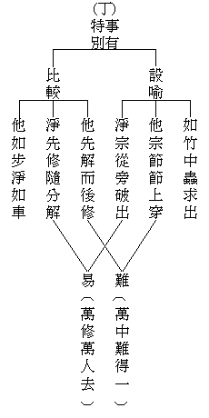 说明净土法门的特殊。‘设喻’:先从比喻上说,然后再做个比较;这个比喻是古德所说的。‘如竹中虫求出’:竹竿是一节一节的,里面有一只小虫,它想出去。‘他宗节节上穿’:八万四千法门,其他的法门采取的方法,好比小虫每一个节都咬破,一层一层往上穿,爬到顶端才能爬出去,费时间很长,要经过许许多多的难关。‘净宗从旁破出’:净土法门,不是竖出,是横超。竖出难,例如天道:六欲天、四禅天、四空天,要修十善业道、四无量心、四禅八定,才能去得了。天道尚且如此不容易,何况出世间圣道。可是净土法门特别,横超的法门,从旁破出,不从竖出。从旁破出,还有个比喻,此地省略了。这个小虫在竹子里向旁边咬,竹子外面有块大石头,常常刮风,竹子在大石头上磨,已经磨损得差不多,所以小虫很容易咬破竹子,很短的时间就出去了;‘风’与‘石’比喻佛力加持。所以净土法门比其他的法门,实实在在要快得多。