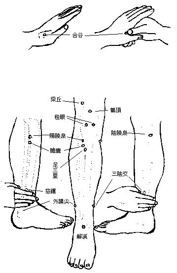 1、胃痛、消化不良:双掌重叠,以肚脐为中心,顺时针推摩一百次,再逆时针推拿一百次;按压合谷及梁丘穴各九次。另外空腹时,做瑜伽贴腹式,其法如下:盘坐或站立微弯,先吸满腹部,呼五分,摒气,腹部上下运动,以能贴腹推挤至背为佳。此法曾试用二○年胃病患者,不药而愈。