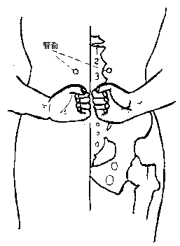 5、腰痛:双手叉腰,拇指在后,其余四指在前,前拇指置于腰部肾俞穴,按压,揉动十分钟,并用弹拨手法弹拨、按揉敏感点(索状硬块、结节)。