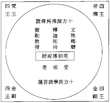 前面曾说过,受持净戒不是容易的事,尤其是求上品戒。忏罪之时,必须请十方三世诸佛证明加被,这便应知受戒坛场的布置是怎样的仪式。正中应供奉释迦牟尼佛为菩萨戒和尚( 得戒和尚 ),在上首应供文殊菩萨为净戒阿阇黎( 羯磨和尚),在下首应供弥勒菩萨为清净教授师( 教授和尚 ),并请十方诸佛为尊证,十方菩萨为学戒伴侣,四天王、八金刚为外护众。不但要以上的诸佛菩萨为加被,还要请现前的传授师亲为传授,这是受戒仪式的设置。今作一‘菩萨戒曼怛啰’于此。