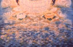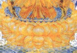 打从画第一笔开始,就没有期待它的完成,因为这幻躯生命随时都会结束,很可能会在画纸上,留下一片的空白,会留下些乱七八糟的笔触,但这也没有什么妨碍,画纸、颜料本都幻化,正如普贤的大愿是永无穷尽的,画佛也是没有完成的时候,我只要支持到最后一口气依然歌咏弥陀;只要凝聚最后一滴彩入弥陀慈眸,永远关注一切苦难;只要奋最后一卡力画接引金手,愿苦难众生握之,同跃莲邦,无量寿经上不是开示我们:‘觉了一切法,犹如梦、幻、响,满足诸妙愿,必成如是刹’吗?能画到何时并不重要,能否完整呈现也不重要,只要在过程中每一笔都尽心尽力,注入‘让自己觉醒’的佛号,但愿‘一笔一画,咸作净土资粮,一见一闻,同登莲池海会,信者疑者皆植道种,或赞或谤等归解脱。’