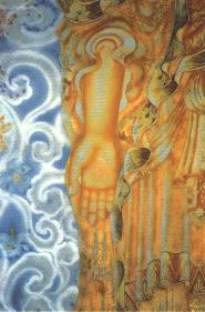 末学每诵念无量寿经到礼佛现光的那一段时,就感染当时与会大众那不可言喻的欢喜踊跃,眼前呈现出一幕影像,依那欢喜的一念画下了底稿。对一个不谙美术的人而言,尝试画此实在是可笑的历程,但也许有一天,会有一个人,长夜忧恼时,会因瞥见它而会心一笑,想起佛慈吧?