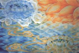 由于不会画,只有祈佛哀佑,画佛期间,每天尽力夜半两点奋起—‘睡眠始寤,当愿众生一切智觉,周顾十方’,踉踉跄跄一步一喘去盥洗,迈向净土,初,体力差时,肿瘤又使腹部胀痛,拜三拜就昏跌四次,很喘,眼冒金星,站直都难,想到简学长发愿捍劳忍苦,拜‘十万拜’为末学回向:想到因骨癌而锯去一条腿的王学长,每天仍珍惜仅剩的一只脚勉力拜佛;想到深夜此刻世上有多少人因苦恼而不眠,我绝不能因畏苦懈怠!想到一位学长说:‘但叫一念悲心起,生命色身皆无碍。’于是,便一次次由跌坐喘促中站起来,在佛悲智气息的吸引下,渐渐加多礼佛次数和时间,最初觉得在黑夜里独自和病躯奋斗,实在比昔日行医连夜不眠值班更难更难,然而由跌倒中也让末学体会到阿弥陀佛实在最了解众生跌倒之苦,而以柔软光莹的七宝地,来作极乐世界的大地,还有飘华成聚!真是柔软金地慈恤我,严净光丽为了我,一切苦心皆为我,尝到了寒冬夜半跌撞的滋味,就格外感恩柔软宝地里的细腻悲怀,不必苦于‘乌青、骨折、脑震荡’,也许您笑末学这些妄想词儿但假如在您生命中,曾有过苦不堪言的感受后,再思净土‘无有众苦,但受诸乐’时也会像末学感恩落泪,又泪水中绽出微笑。夜半里,观想和一切众生一起礼拜佛,然后盘坐起来作完早课,把净土五部经由头念到尾,再渐渐由头背诵到尾,这是最欢悦的滋味,和极乐世界里赫奕欢喜又雄猛无畏的菩萨干一杯甘美的弥陀果汁,全身的细胞就充了电似地欢喜起来,欢喜念佛。若天天聆听弥陀昔日修行时每一感动天地的心愿,再颓唐也会振作起来!天天念极乐国民的真实功德,再衰弱也得披弘誓铠!在愿力的世界里,困难虽有,却不能阻挠行动,越念越加感受四十八愿壮丽伟大的浪潮,真是吞尽融化一切苦痛,吞尽融化一切无奈!画佛期间,通常都如此从夜半奋起,五经诵好才用早斋,上午依体力调节姿势念佛,或者礼佛,恩师告诉末学,上广下钦老和尚的开示:‘身虽不自由,可以念佛,给心自由。’真庆幸在身体不灵光的时候,能体会这一开示。下午,才于斗室洒净,和佛亲切面对面,学习动笔。实在不是末学画佛,而是佛慈摄受末学忘即身苦,是弥陀和诸位活生生的菩萨提著末学的衣领,飞度生命幽谷难关。