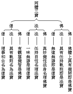 (一)同体三宝。亦名一体三宝,亦名同相三宝。体即清净法界真如法身;佛性即是法性,法性即是僧性,古名同体。今就一一体上皆具有佛法僧三义显示如表一: