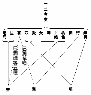 十二有支,在远近因果,和已润未润的因果关系上,诸支相望。《缘起经》、《瑜伽论》、《对法论》、《成唯识论》等,皆略摄为四支:一能引支、二所引支、三能生支、四所生支。