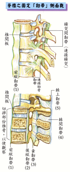 脊椎骨:本是一块块个别的骨头。是由5条主要的‘韧带’,将它们连接成串。周围又附有数十条肌肉。每块脊椎骨体中间又有一块富有弹性的‘椎间板’,充当衬垫。
