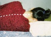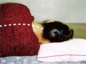 侧卧时,枕头之高度,对‘颈—胸椎’角度,影响甚大,若角度不对,一夜睡卧,连续压迫数小时,不但血流不通,易做恶梦;也由于脑和脊髓,供血不良,会波及全身,发生严重影响。请注意:各图中脖子的‘斜度’。(枕头高度不同)