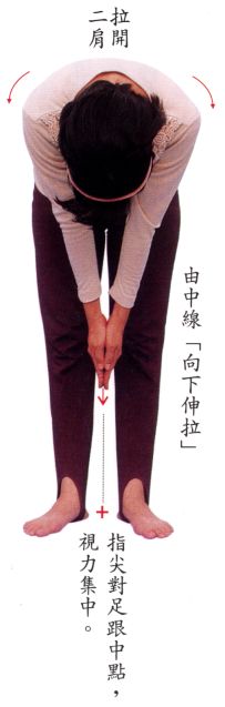 ·若不配合俯首,拉开颈椎及胸椎,舒活神经,则长期压迫,不只肩会酸痛,连手臂、手指亦会酸、麻、痛。若能俯首,拉开颈椎,则可改善。故此动作之要领,是要在垂头状态下,松肩。
