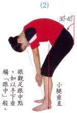 小腿及膝向后贴,靠稳必然能直,注视中线,上身松垂,‘脐’沿中线,直下降,趋近足跟。 |