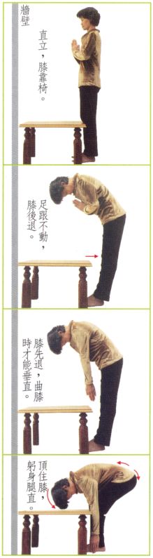 (4)也有人小腿虽直,重心放在足跟,却蹲不下去,无法弯腰。这是腰下部脊椎太僵紧,(腰荐关节)一时拉不开。(多练则慢慢开)