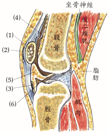 (1)膑骨 (2)膑前皮下囊 (3)膑深下囊 (4)膝盖上囊 (5)膑下脂肪体 (6)膑下滑膜襞 注:襞音ㄅㄧˋ,本意是‘折叠衣’。