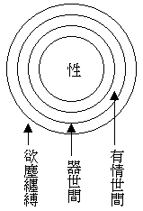 前面画的这几个圈子,是表明世间的意思。中间的‘性’圈,譬如我人的‘真如本性’,是每个人具有的。在这本性外围的一层圈子,是表显的五蕴和合的假身,叫作‘有情世间’;这‘性’就寄托在这上边。在这有情世间外围的又一个圈子,是表显的四大积聚的山河大地房屋等‘器世间’;这五蕴假身就寄存在这‘器世间’上。在最外围又有一个大圈子,是表示五欲六尘一切的缠缚。