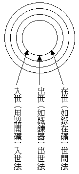 以上说的这三类众生,与处世间的状况,也有一个比喻,第一类凡夫困在世间,为尘沙缠缚,如铁在矿。第二类声缘,超出世间,如出矿之铁,锻炼成器,已不再受尘沙的缠缚了。第三类菩萨,出世而能入世,如持铁器向矿里去开发,以将矿里的铁尽掘出来为志愿,是出世不贪著涅槃为乐,入世亦不为欲尘所染,如图所示。