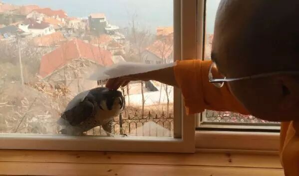 在2014年3月29日这一天,发生了一幕令众惊叹不已的场景,在下午时分,正在布置新佛堂时,一只鹰(隼鹰)从外飞来,撞破纱网,停留在了窗边,它的突然到来沸腾了整个道场。整个过程,被在场的师兄们用相机记录下来。 师父来到这只鹰身边,为其皈依诵经,它非常专注的听着师父诵经,时而侧耳倾听。 当师父念完一段好几分钟的经文后,它却一直停留在窗边而不肯走。师父见状,便慈悲的将它抱进屋来。 众师兄纷纷拿来吃的喝的,它只是看,好像食物对它毫无诱惑力。 当有位师兄正试图伸手去抚摸它时,不曾想,这只鹰突然扭头,不高兴的扑哧一声,抗拒不从。 当觉得是不是因为饿了前来觅食时,却发现给的食物和水,它一点都不感兴趣。 这一幕令在场的师兄们都惊奇不已。此时只见它扭身转头看着大家,大家于是纷纷说到,想听经就给师父磕头吧。它像是听懂了一样的低头俯身。有师兄提议到,那请师父给你起个法名吧。 师父见此,便向它问道:“你是来听经的嘛?”它点点头。 师父再问:“你要走嘛?”它摇摇头。 这一幕令在场的师兄们都惊奇不已。此时只见它扭身转头看着大家,大家于是纷纷说到,想听经就给师父磕头吧。它像是听懂了一样的低头俯身。有师兄提议到,那请师父给你起个法名吧。 |