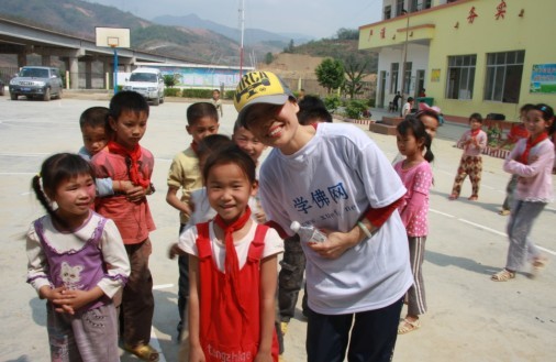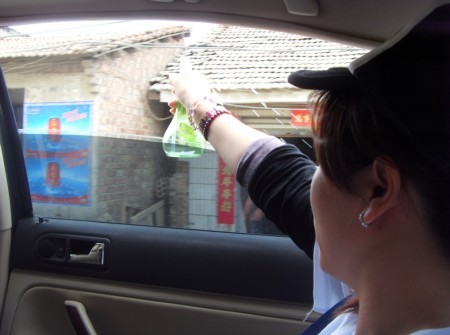 学佛网工作人员洒甘露水 由于火车提前到达南宁,我们顾不上洗漱又赶往百色的长途公交车,因长途公交车绕行导致原本三小时可到达百色,但最终5小时才到达百色!虽然大家很饿,也顾不上找地方吃饭只想到快点见到灾区的人民!