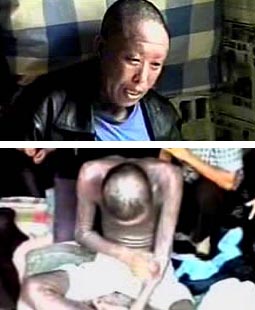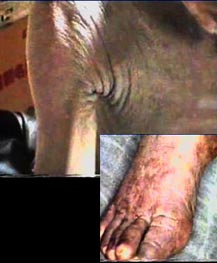 中午时分,众居士来到「蛇人——韩永波」的家里,果然,众人目睹韩永波盖着厚厚的棉被,躺在炕上,只露出头部。打开被子,众居士被眼前的景象惊呆了,韩永波面部及全身都呈紫黑色,褶皱布满全身,一层层白色的鳞片彷佛蛇皮一般,全身痛痒难忍,两手使劲不停地抓挠,脱落的鳞片像雪花一样洒落在被褥上,他咧着嘴,痛苦的呻吟着,好像在乞求上帝对他的宽恕。