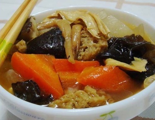 原料:香菇、金针菇、腐竹、木耳、烤麸、胡萝卜、白萝卜、姜末1、起锅热油,爆香姜末,先放入香菇、烤麸稍炒,再倒入砂煲。砂煲煲出来的香,如果没有,直接在锅里煮也可以。2、将其他材料也倒入煲中,并加适量的水,以刚好盖过材料为准。待水烧滚后,调小火慢慢炖20分钟左右。最后加盐、蘑菇精、少许酱油调味即可。心得:这里的材料可以灵活多变,比如多放几种菇类,还可以加入油豆腐、面筋等。