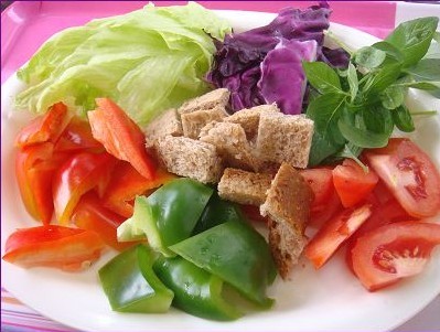 原料:西生菜(包生菜,图见最后)、紫椰菜、沙葛(地瓜,图见最后)、红菜椒、绿菜椒、西红柿、九层塔、全麦包一片这是包生菜,是蔬菜沙拉中不可缺的。沙葛是广东的叫法,北方叫地瓜或白地瓜(注意红薯在某些地方也叫地瓜),台湾叫凉薯,还有叫豆薯做法:1、所有蔬菜用淡盐水浸泡十分钟,洗净捞出;西生菜、紫椰菜用手撕成片;红、绿菜椒去籽切块;西红柿切片。2、麦包切小方块,用少许油炒香脆,备用。3、将以上材料(面包除外)装入盆中,用适量盐、白糖、白醋、香油、少许蘑菇精调味拌匀,装盘,最后加入炒好的麦包丁即可。