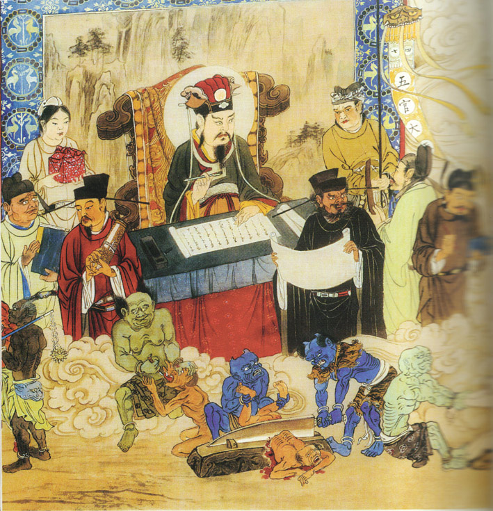 第四殿五官王 五官王司掌合大地狱,此大地狱之苦又胜于前二者,其苦无边。堕此地狱之罪根为生前乐行杀、盗、邪行三业。观此地狱罪人为大火普焰所烧,眼出火泪,彼泪是火,即焚烧其身,阎罗人又劈其眼骨,复以铁钩割打,热铁钳擘其粪门,洋热白镴灌满其内,外有大火复烧其外,内外极烧,受其大苦。如是经无量百千年中业方竟。若生人中,常有癖病在其腹中,若身燋枯,又形貌丑陋等。